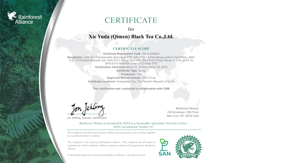 谢裕大(祁门)红茶有限公司由谢裕大茶叶股份有限公司投资1.2亿元兴建于2013年建成并投产,位于“中国红茶之乡”——安徽祁门县经济开发区绿色产业园。公司占地60亩,建有一万五千多平方米的红茶初精制车间、员工公寓和办公楼、产品展示和物流中心;建有领先的智能化清洁化红茶生产线;拥有由可持续农业发展网络认证机构颁发的国际可持续农场(雨林联盟)认证的茶园千余亩,认证证书注册号码:RA-G-009024。
