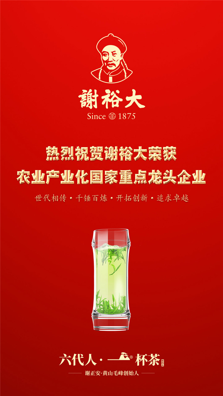 2018年谢裕大可谓喜事连连,本次荣获“农业产业化国家重点龙头企业”是今年继谢裕大再次通过“高新技术企业认定”,荣获“2018中国茶业最受消费者认可十强企业”、 “2018年度安徽名牌”、 “安徽省诚信计量示范AAA级单位”“安徽省企业标准化良好行为AAA级示范企业”、“2017年度省认定企业技术中心认定”,董事长谢一平入选首批 “中国制茶大师”等荣誉后获得的又一殊荣!